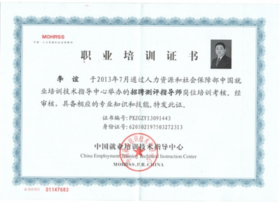 曾获得中国就业培训技术指导中心颁发的招聘测评指导师