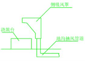 铸造件厂铸造车间共有2台熔化炉,4个浇筑流水线,每个浇筑流水线有8个浇筑工位。其产生的烟尘主要是在熔化炉及浇筑时产生。由于4排浇筑流水线并不是同时工作,考虑只有两排同时工作的情况下使用风量。由于浇筑时流水线是长条形的,为了能把产生的烟尘抽走处理掉力维环保技术人员在设计时采用侧吸风口的烟尘粉尘治理方式,如下图: