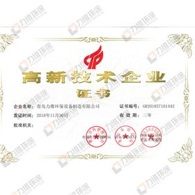 2015年11月,青岛市公布首批通过认定的高新技术企业,青岛力维环保榜上有名,成为青岛2015年第一批国家高新技术企业。