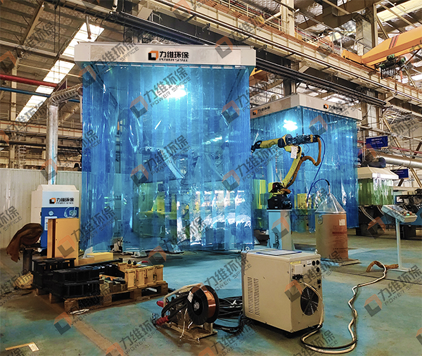 客户车间工件加工区域伸缩房宽3.3米,长14米,高度4.5米,净化方式采用伸缩房+管道+除尘设备。青岛力维环保多次现场实地勘测,并结合客户要求及现场实际工况,为其设计研发了此款机器人焊接除尘设备。此款设备采用伸缩式排烟房的形式收集烟尘,吸气罩采用四周软帘进行密封,排烟房可伸缩行走、限位可靠。
